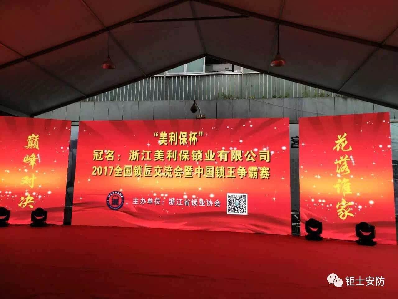 5月23日至24日,2017年全国锁匠交流会暨“美利保杯”中国锁王争霸赛在中国五金之都浙江永康国际锁具展示中心隆重举行!本次盛会由浙江省锁业协会举办,浙江钜士安防◎美利保锁业独家冠名赞助。参加此次盛会的领导及嘉宾有浙江省公安厅特聘专家徐州建处长、浙江省锁业协会陈平弟会长、浙江省美利保锁业的限公司董事长杜胜勇、国家轻工五金质量监督检测上海站站长及上海市工具工业研究所所长徐东海、中国锁业界战略联盟以及全国多省市锁业协会领导等。同时,来自全国各地的近百家顶尖优秀锁企及锁匠数百人参加了此次盛会。腾讯视频、搜狐视频、永康地方媒体等众多国内知名媒体对此次盛会进行了跟踪报道,行业媒体开锁宝进行了全程现场直播。